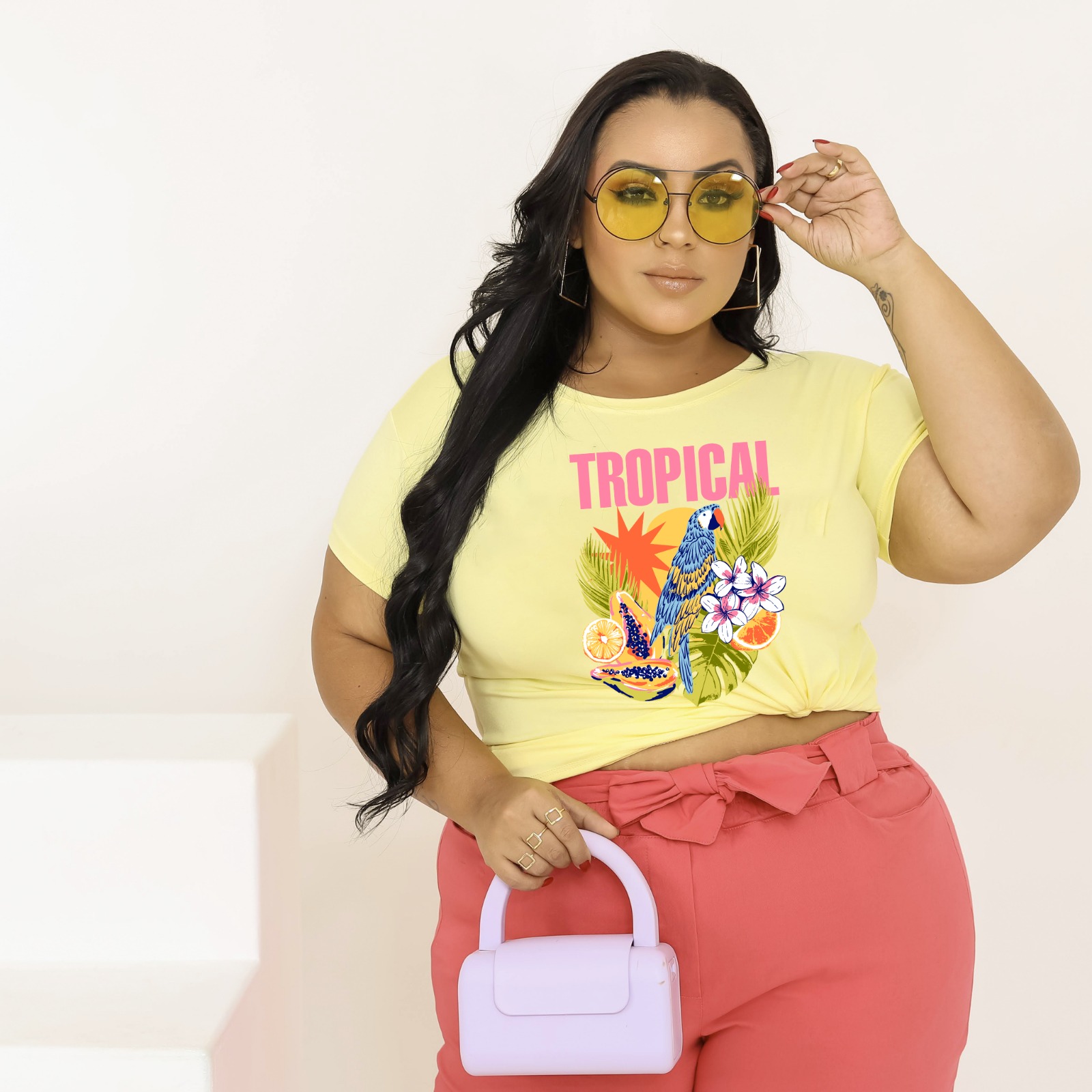 T-SHIRT PLUS SIZE ARARA TROPICAL DTF AMARELO BEBÊ XG
