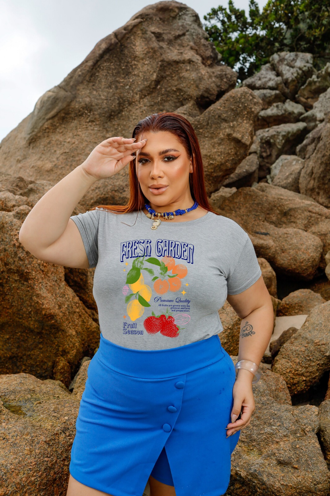 T-SHIRT PLUS SIZE FRUTAS FRESH GARDEN DTF CINZA XG
