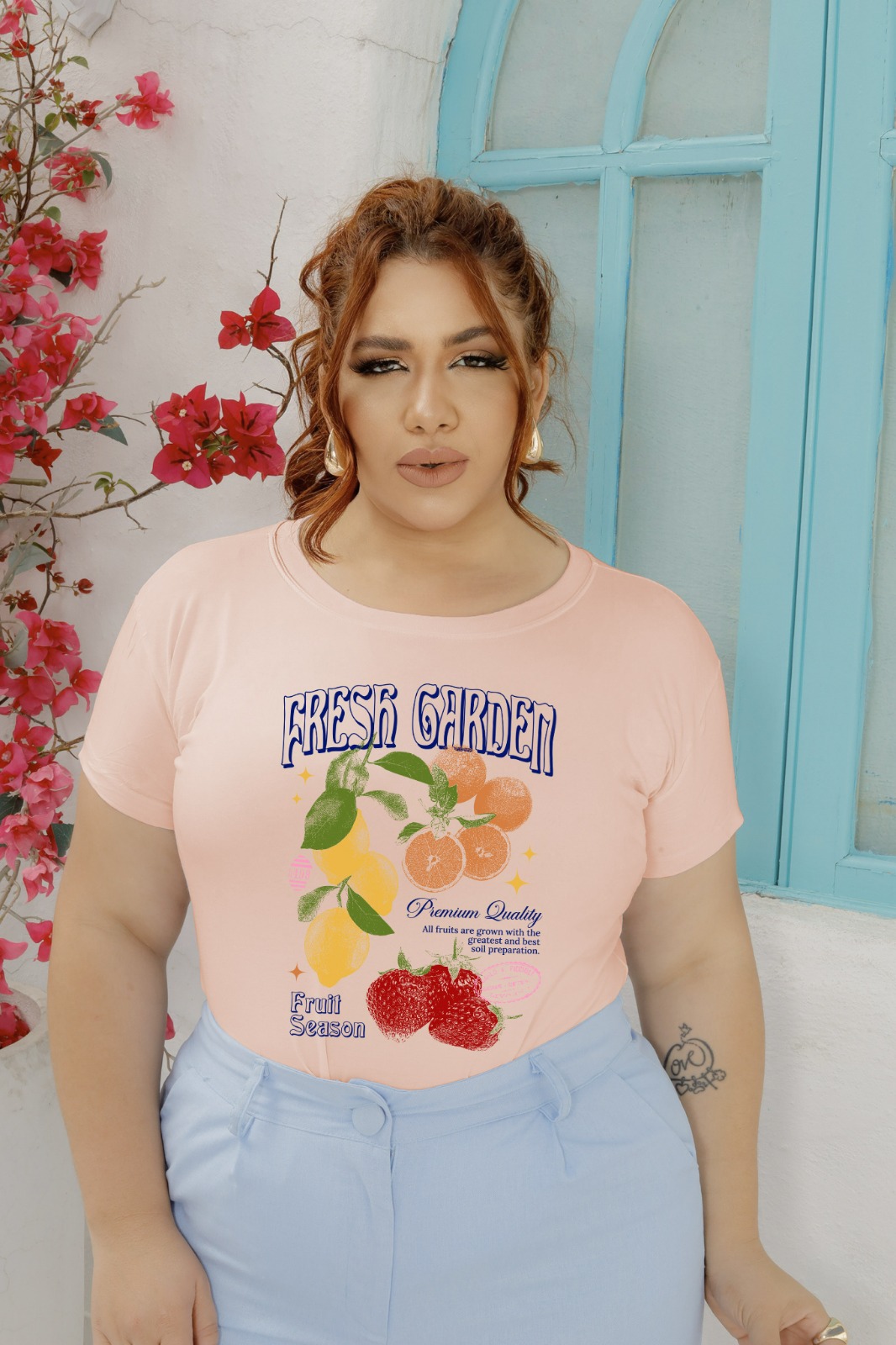 T-SHIRT PLUS SIZE FRUTAS FRESH GARDEN DTF ROSA BEBÊ XG